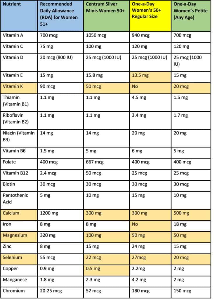 - Comparison: Centrum Silver Minis and One-a-Day Women’s Petite meet the RDA, while the One-a-Day Women’s 50+ falls slightly short of the RDA.